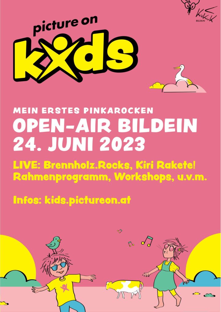 ein Herzensprojekt feiert dieses Jahr Premiere, das schon länger in der Schublade unseres Veranstalter:innenteams liegt: Ein Festival für Kinder! Und wer das picture on festival kennt, der weiß um was es hier geht: Ums gemeinsame (pinka)rocken! Beim Pilotversuch picture on kids sind Ende Juni im Bildeiner Festivalgelände erstmals die Kinder die ganz Großen und können ein eigens für sie auf die Beine gestelltes (kleines) Musikfestival erleben.